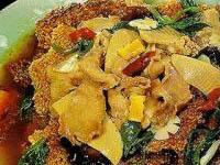 3、炒锅置火上,下猪化油烧热(约180℃),将肉片入锅炒散,滑熟,倒入漏勺。锅内留底油,下冬菇、玉兰片,泡辣椒、姜,蒜、葱,稍炒,下肉片炒匀,烹入芡汁,下豌豆苗,稍收,起锅装碗,锅巴入烧沸的素油锅中,炸至黄色。浮起即捞起,装入窝盘,并浇上少量沸油,将锅巴和炒好的肉片同时上桌,趁油烫迅即将肉片淋于锅巴上即成。