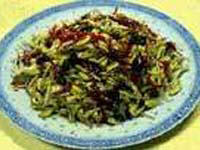 2、香油烧至5成熟,放入花椒粒炸成金黄色捞出,将辣椒丝,葱姜丝放入,再依次放入木耳丝,酱油,料酒,醋,白糖,精盐浇开后,浇在豆芽上即成