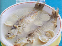 活鲫鱼2尾,活蛤蜊250克,熟火腿3片,笋肉5片,水发香菇一只。